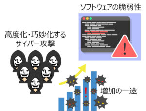 また、クラウドサービスなどで用いられる仮想化技術の多くは、ハードウェアの機能をソフトウェアで実現するため、アプリケーションプログラムは複雑化する一方です。そのため、ソフトウェアの欠陥となるような脆弱性も大幅に増えています。