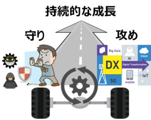 DX推進による「攻め」と、セキュリティ対策による「守り」は、車の両輪のごとく取り組む必要があります。どちらかが欠けると、ビジネスは目標を目指して真っすぐ進まなくなります。